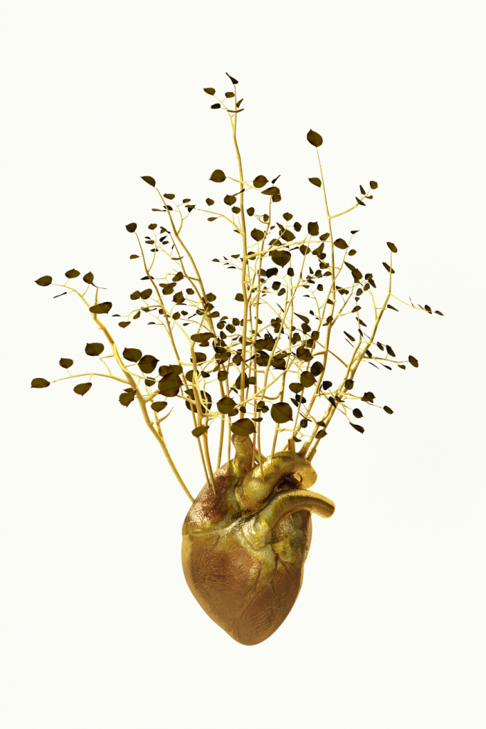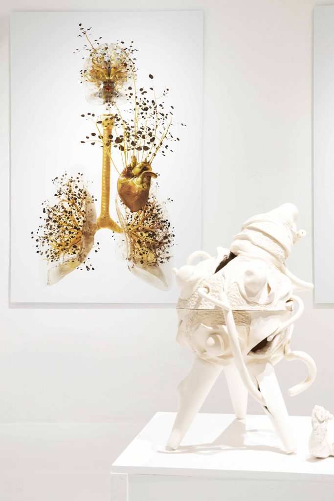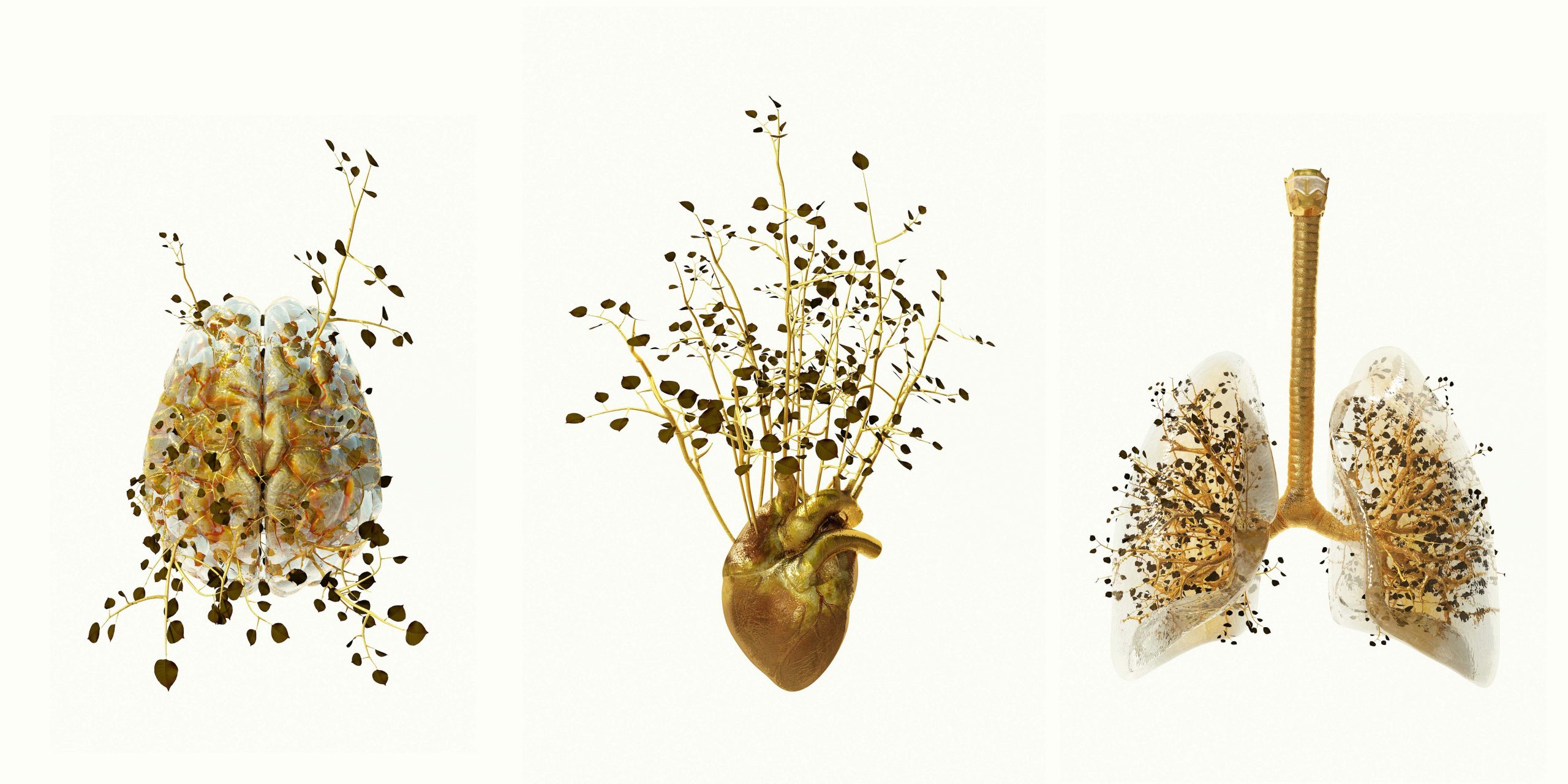Picadas invites us into a realm where art seamlessly coexists with technology. His series of prints, which includes works such as “Knee,” “Heart,” “Brain,” and “Lungs,” captivates with hyperrealist golden organs and solitary leaves growing on pristine white paper.
