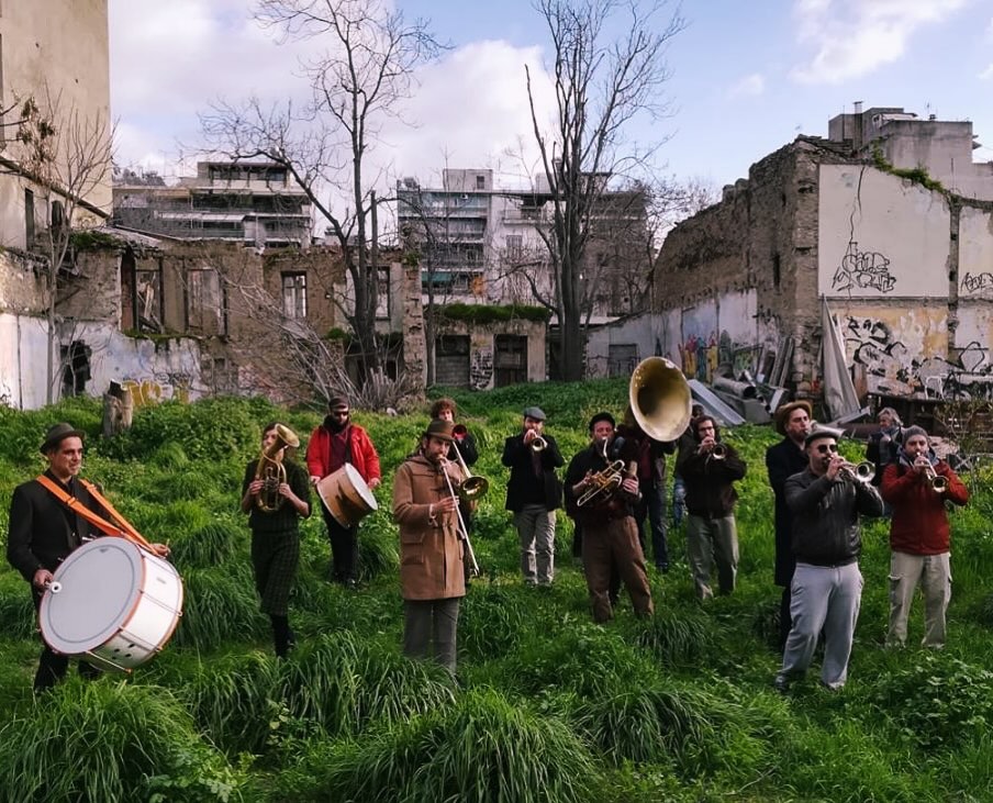 With the 20-member Balkan brass ensemble Agia Fanfara.