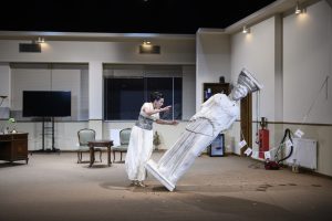 In this bold new adaptation of Strindberg’s tragicomedy, two eccentric lovers—locked in a vampiric, dysfunctional marriage—celebrate their 25th anniversary in a whirlwind of dark humor, existential dread, and theatrical excess. Kurt’s sudden arrival threatens to upset their grotesque harmony in this surreal, smoke-filled production.