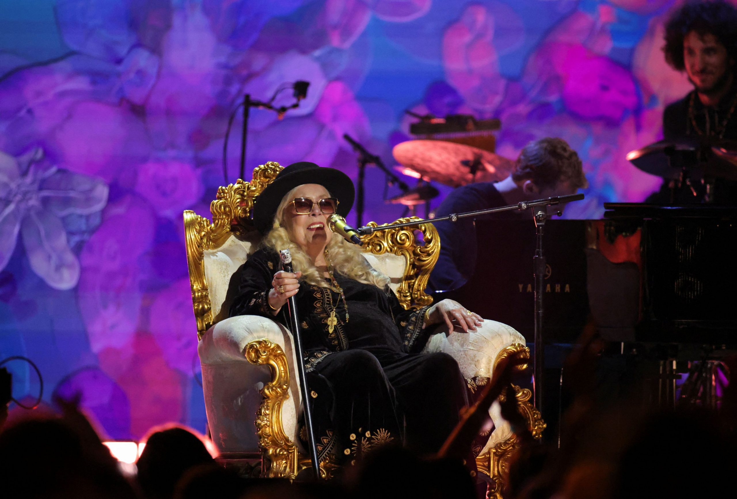 Joni Mitchell performs during the FireAid benefit concert for Los Angeles wildfire relief efforts, in Inglewood, California, U.S., January 30, 2025. REUTERS/Daniel Cole