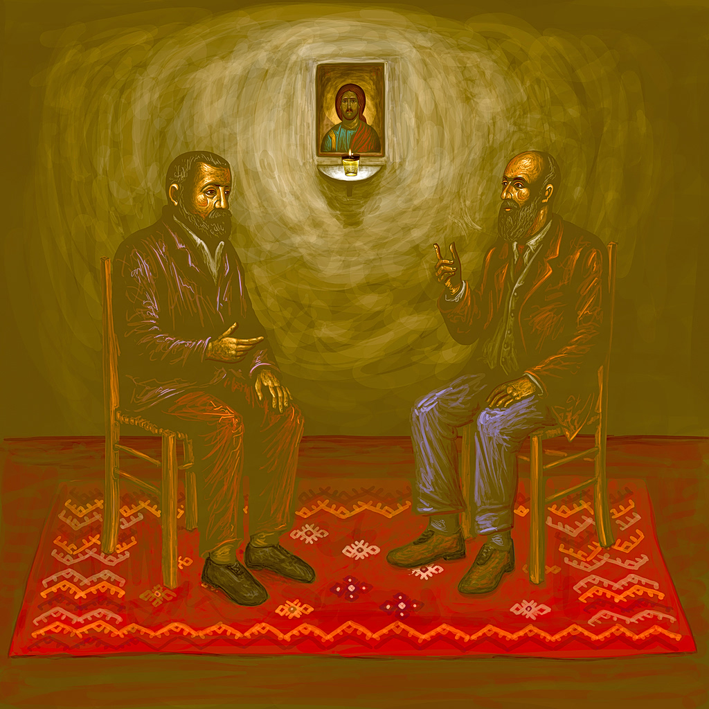 By Babis Pylarinos: Alexandros Papadiamantis and Alexandros Moraitidis, in Skiathos, in Humility, 2025, digital painting, 52 × 52 cm.