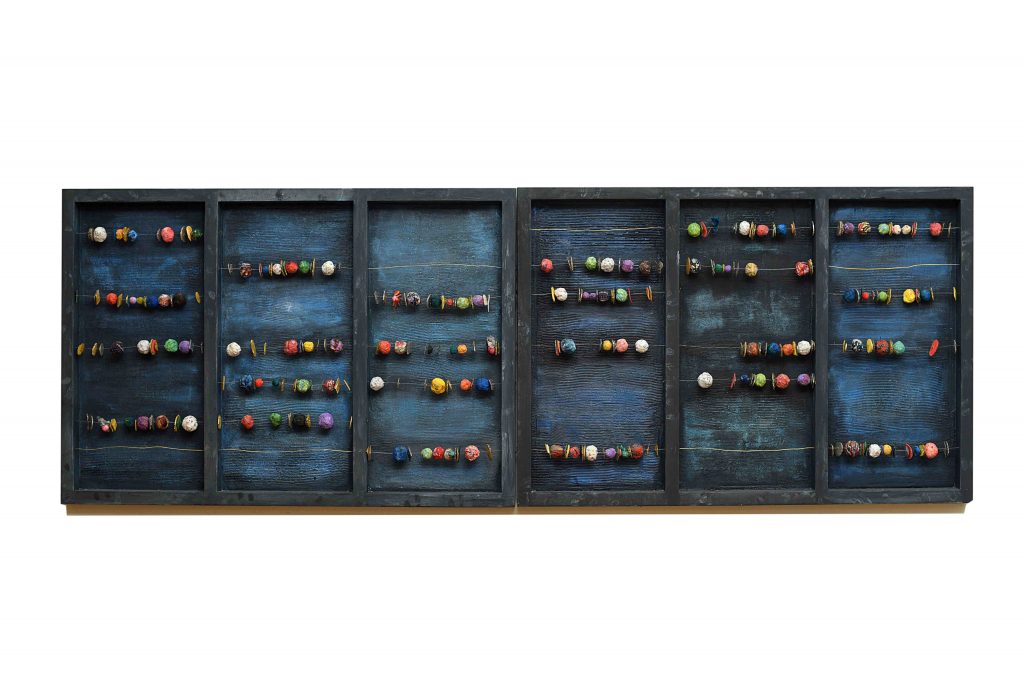 Combining her love of mathematics and training in architecture, Krikki creates layered works using materials such as wood, fabric, plaster, and wire. These compositions merge realism and metaphysics, blending scientific precision with emotional depth.
