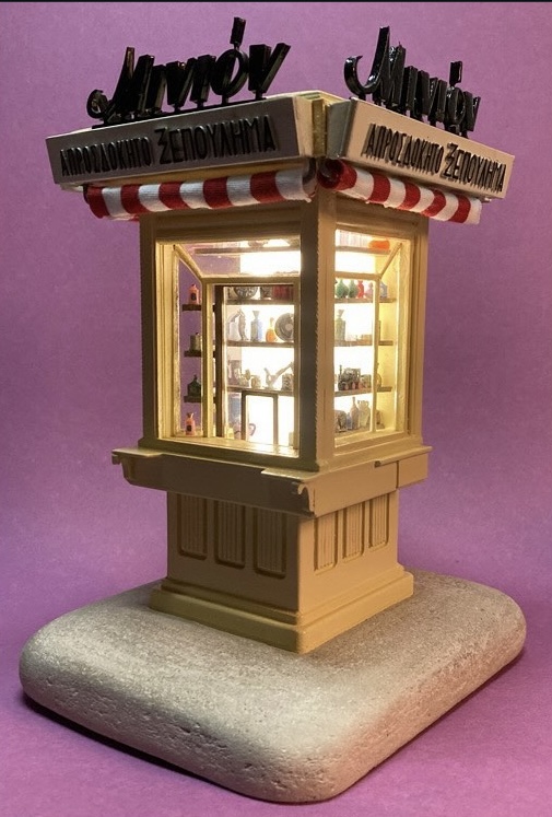 From the polygonal kiosks of Syntagma Square seen in vintage postcards, to the first “Minion” at Chavteia, the “Muses” of Omonia Square, the famous “Koutalas” kiosk in Glyfada, and even the kiosk that collapsed on Panepistimiou Street during metro works in 1997, Finch’s sculptural reconstructions map a parallel history of everyday Athenian life.