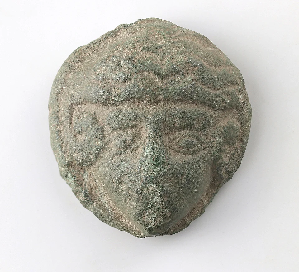 The artifact was identified as a bracket, measuring approximately 2.7 centimeters in diameter, and is made of a bronze alloy. It depicts an engraved portrait of a man with wavy hair adorned with a crown featuring twisted ram horns, as stated by Museum West Zealand.