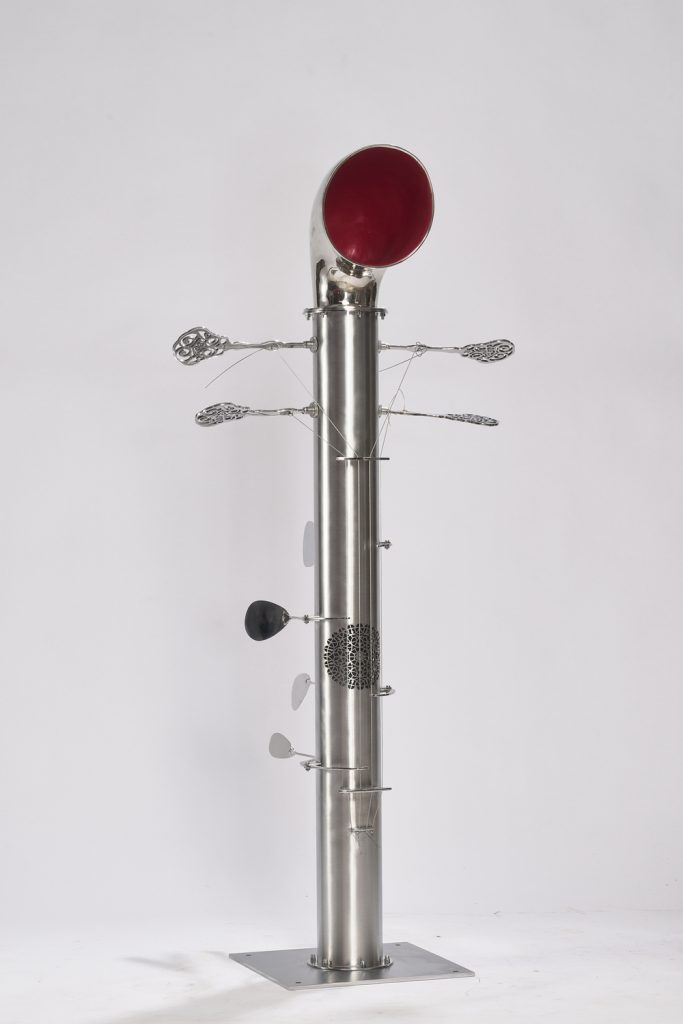 Yiannis Kolokotronis, professor of Western Art and curator of the exhibition, writes about the works in this apparent chaos: “… Gavalas’ new project is a combined effort to weave a web of experiences that transcend the boundaries of time and technology and take the viewer on a journey of auditory sensation, memory and emotion that connects people. Five polished ship funnels lose their functional status and become conduits for a symphony of sounds. Equipped with built- in speakers inside their cylindrical bodies (similarly to Gavalas’ artworks at Alimos’ Marina), strings and musical keys on the outside, they echo the sounds of the sea and the wind, amplifying the acoustic experience of the space, transforming their realistic context and altering the memory to be replaced by modern acoustic aesthetics.”