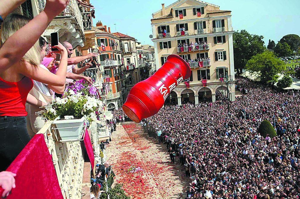 In Corfu, locals celebrate the “first Resurrection” at exactly noon on Holy Saturday by throwing massive clay pots (“botides”) from their balconies. The city prepares for weeks, with handmade pots ready for their one-time flight. The smashing of these pots symbolizes the casting away of evil and the welcoming of new life. Police even issue notices the day before to clear parked cars from the streets to avoid damage. The festive chaos is accompanied by philharmonic bands and crowds cheering from below.