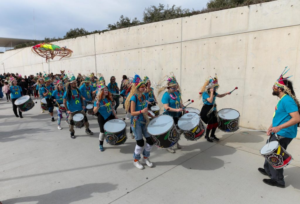 Carnival celebration with animation, jugglers, Brazilian percussion, and other entertainers