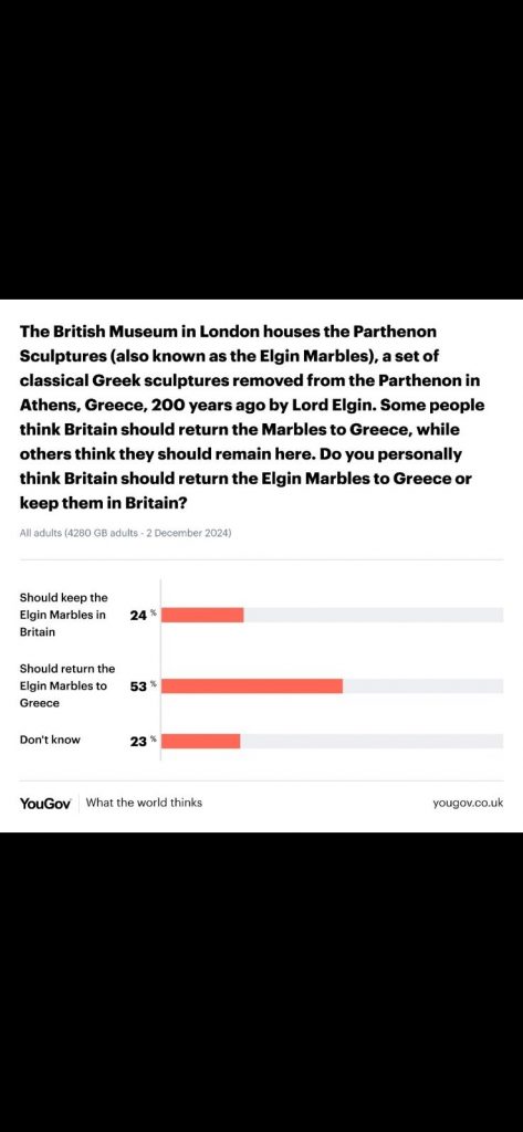 “Some believe that Britain should return the Marbles to Greece, while others believe they should remain here. Do you personally believe that Britain should return the Elgin Marbles to Greece or keep them in Britain?”, was the question asked of respondents.