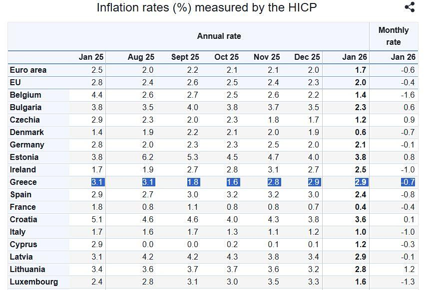 Greece’s annual inflation rate was revised upward to 2.9% in January, according to final figures released by the European Union’s statistics agency, Eurostat.
