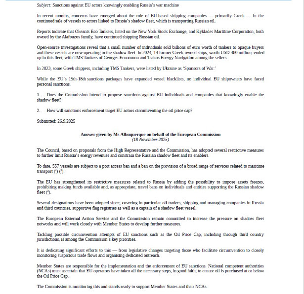 The question asked the European Commission to clarify whether it intends to consider imposing sanctions on European entities that, according to journalistic and other reports, may facilitate such transports. Mentioned among these are the shipping companies Okeanis Eco Tankers and Kyklades Maritime, owned by the Alafouzos family.