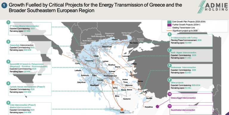 ADMIE’s development program for 2025–2034 goes beyond securing Greece’s energy needs. Key domestic projects include the €2.8 billion electricity interconnection of the Dodecanese islands and a €1.4 billion project linking islands in the North Aegean, both aimed at strengthening supply reliability and reducing dependence on local generation.