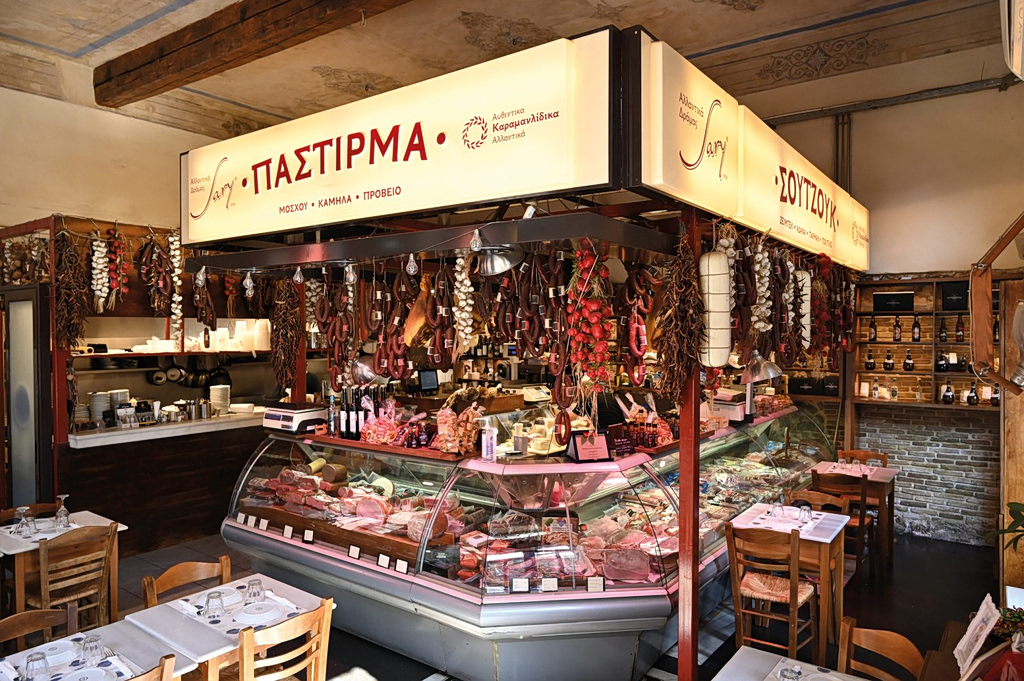 For pasta lovers, the star attractions include aged Greek cheeses and specialty cured meats — especially the renowned handmade Karamanlidiko pastirma made from beef, mutton, or even camel, along with traditional Politiko and Karamanlidiko soutzouki.
