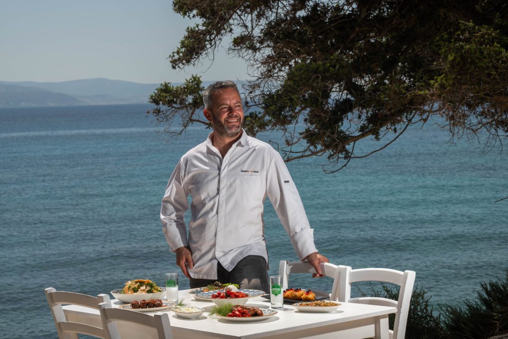 “My parents were both cooks—we had a little ouzeri (meze tavern) in Larissa, and I grew up surrounded by that world. Every summer, my mother would make gigantes with wild greens and herbs for the tavern. She topped them with feta and baked them until golden. I’ve taken her recipe and added elements like asparagus from Evros, chanterelle mushrooms, and sometimes wild garlic. Instead of feta, I finish the dish with a graviera cheese sauce from Syros, as a tribute to her.”