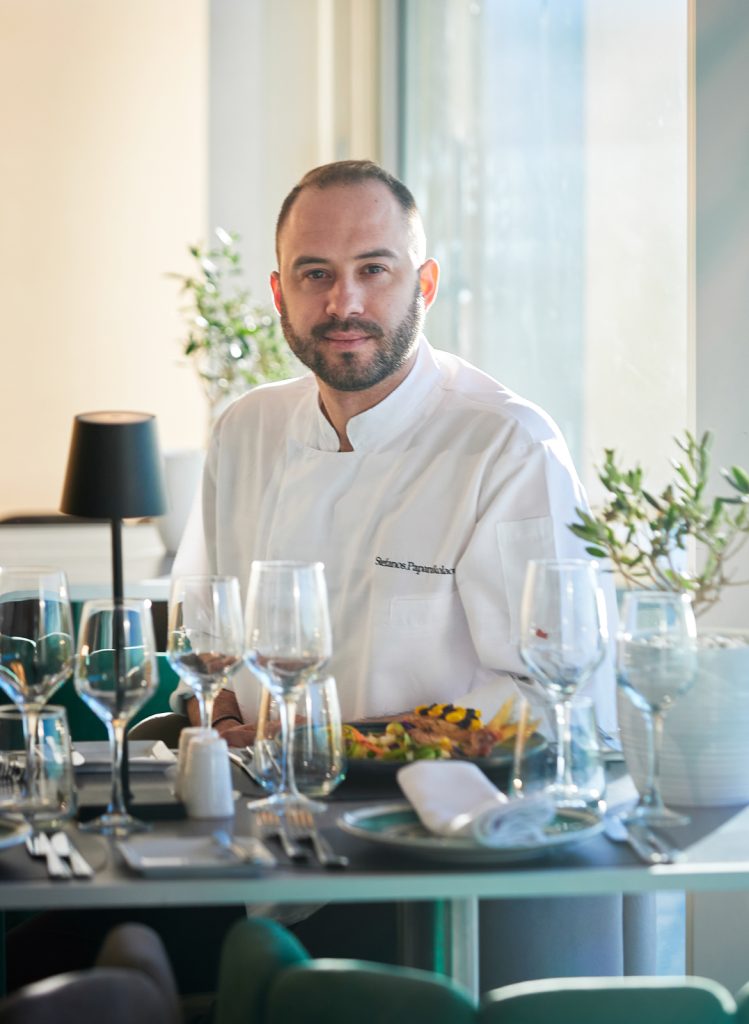 “Giouvetsi has strong roots in my childhood. I grew up in a village in Corinthia, where we raised our own animals and baked in a wood-fired oven. Every Sunday and Thursday, there would be a tray of stuffed vegetables or giouvetsi slow-cooking for hours. I’ve taken that memory and refined it—using beef cheeks cooked stifado-style, orzo from the Taygetus mountains, aged Naxos cheese, and pickled onions. It’s my way of bringing traditional flavors into the present with respect and care.”