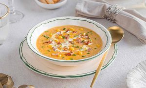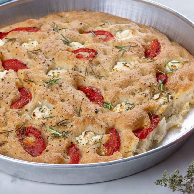 Light, airy, and golden-crusted, this focaccia is elevated with dollops of cream cheese, juicy tomatoes, and a touch of rosemary. A stunning centerpiece for your table, delicious served warm with a drizzle of olive oil.