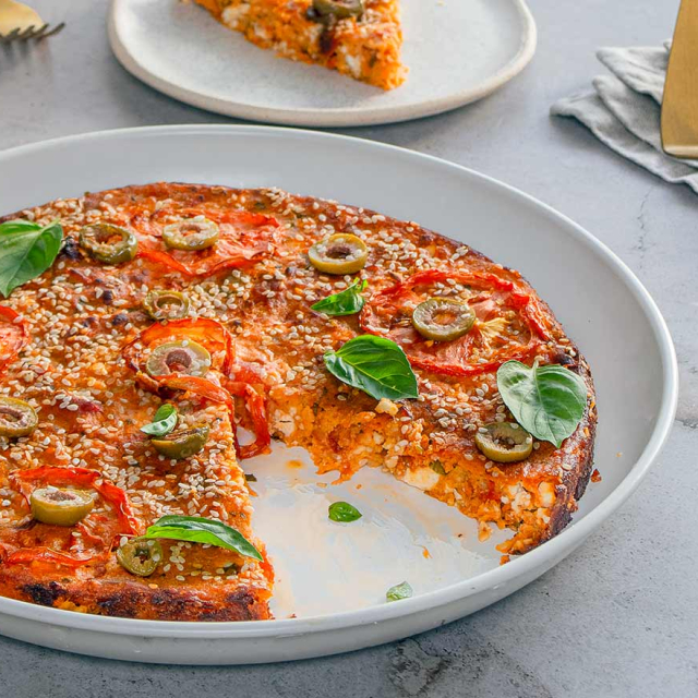 Generously grease a shallow 32 cm (12-inch) baking dish or pie pan with olive oil.