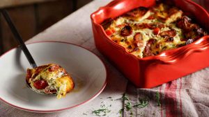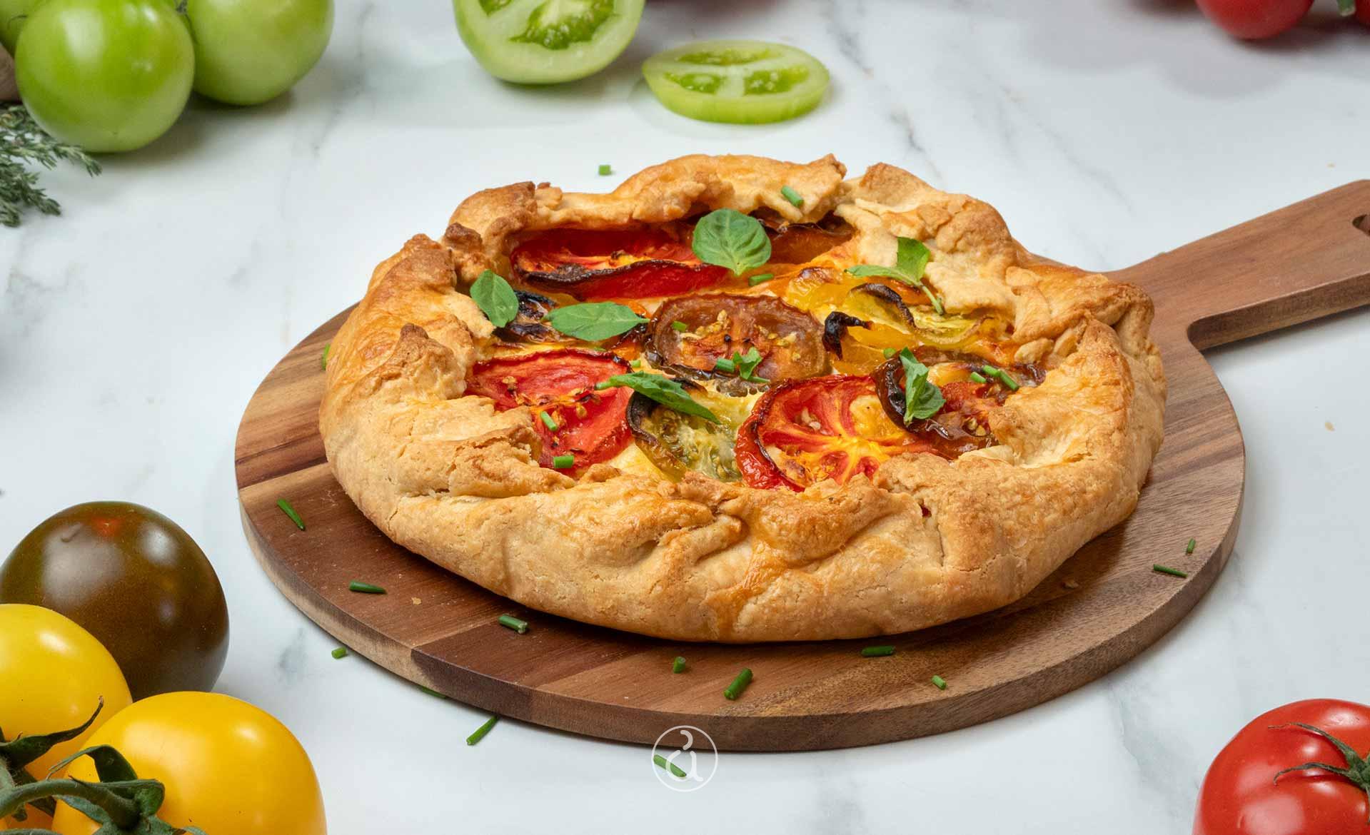 - Garnish the cheese and tomato tart with fresh herbs and serve.