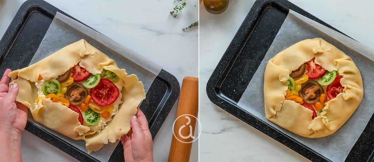 - Fold the excess dough over the filling, partially covering the edges of the tomatoes.