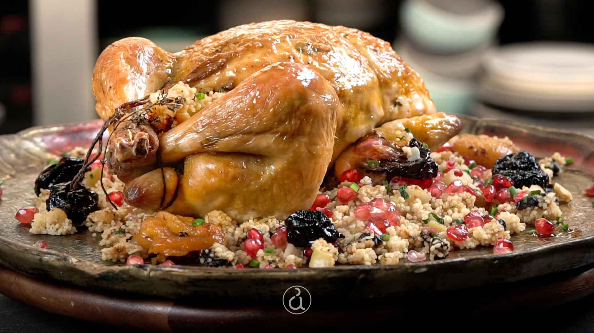 Stuff ⅓ of the mixture into the chicken cavity and reserve the rest for garnish.