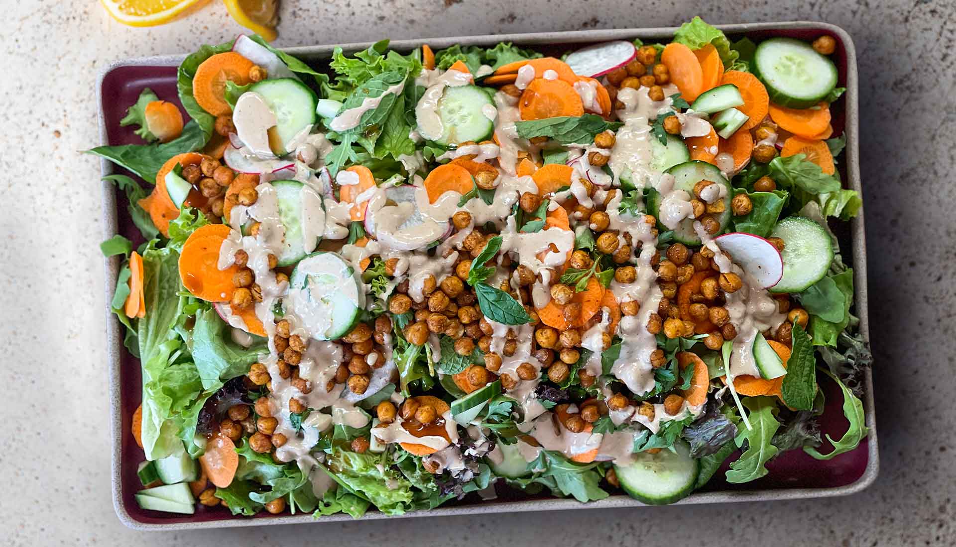- Add salt to taste. Drizzle the dressing over the chickpea salad.
