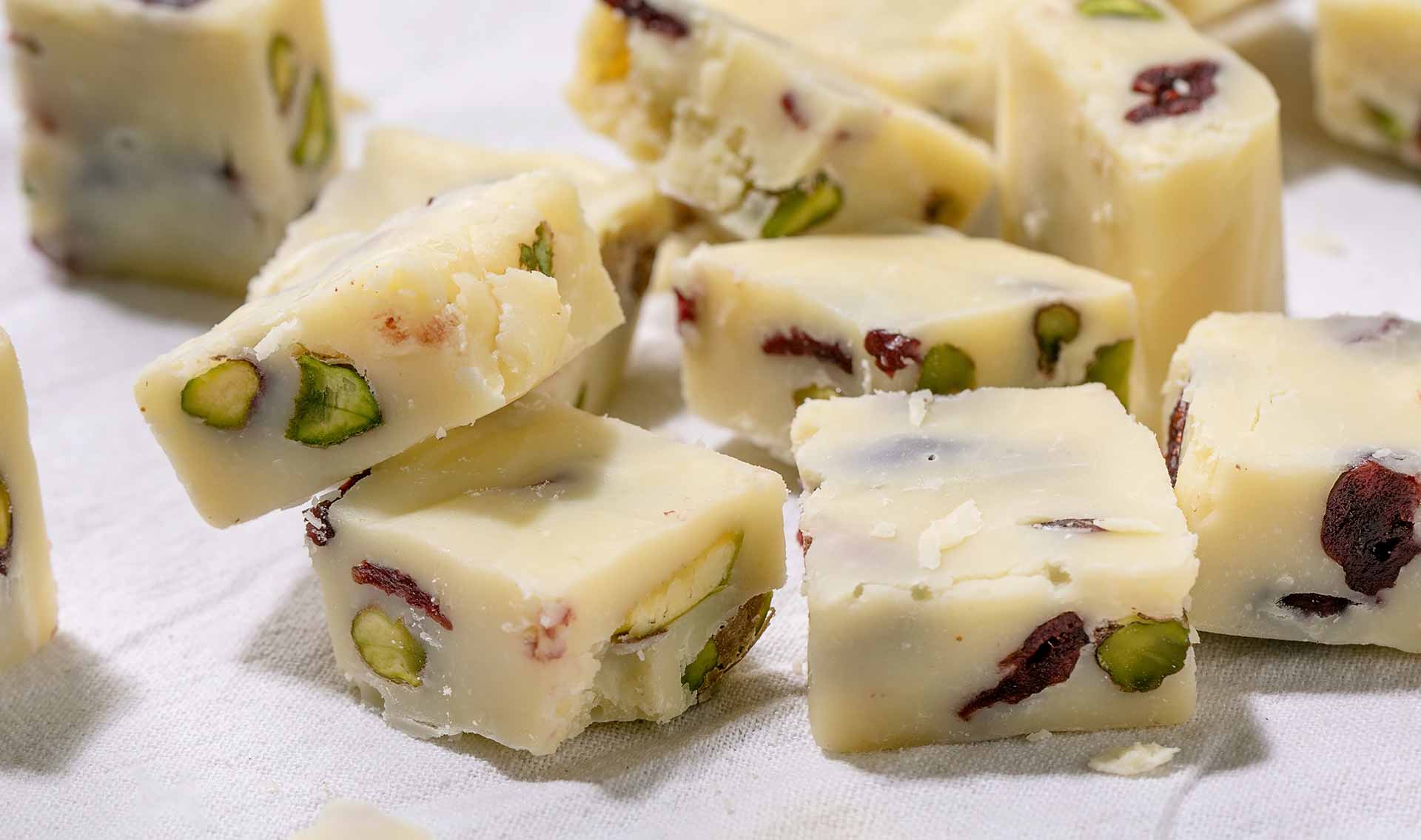 These elegant white chocolate bites are perfect for festive occasions or as a homemade gift. Store in an airtight container in a cool place