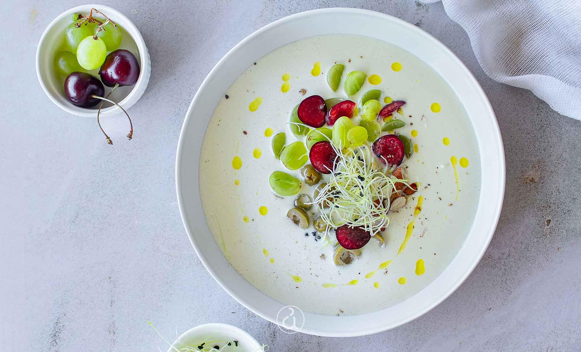 - Serve the cold almond soup immediately in wide bowls.
