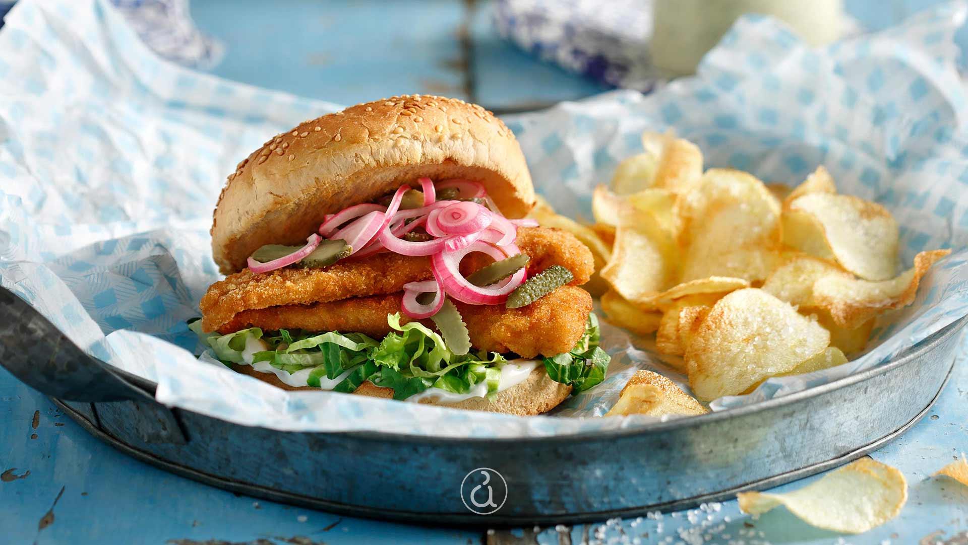 - Place the shredded iceberg lettuce inside, top with the fried fish fillet, and then add the marinated onions and pickles on top.