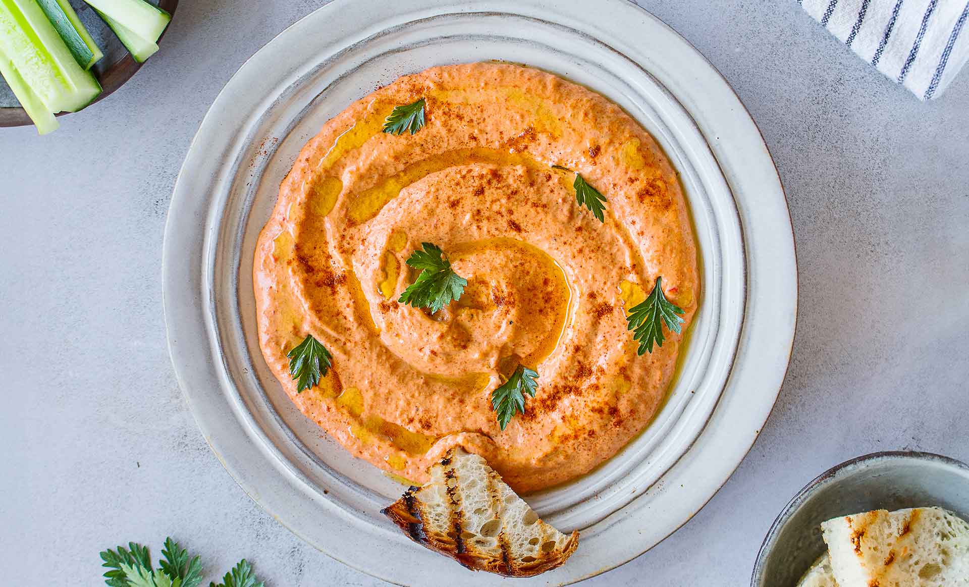 - Serve the hummus chilled with cucumber sticks and toasted bread.