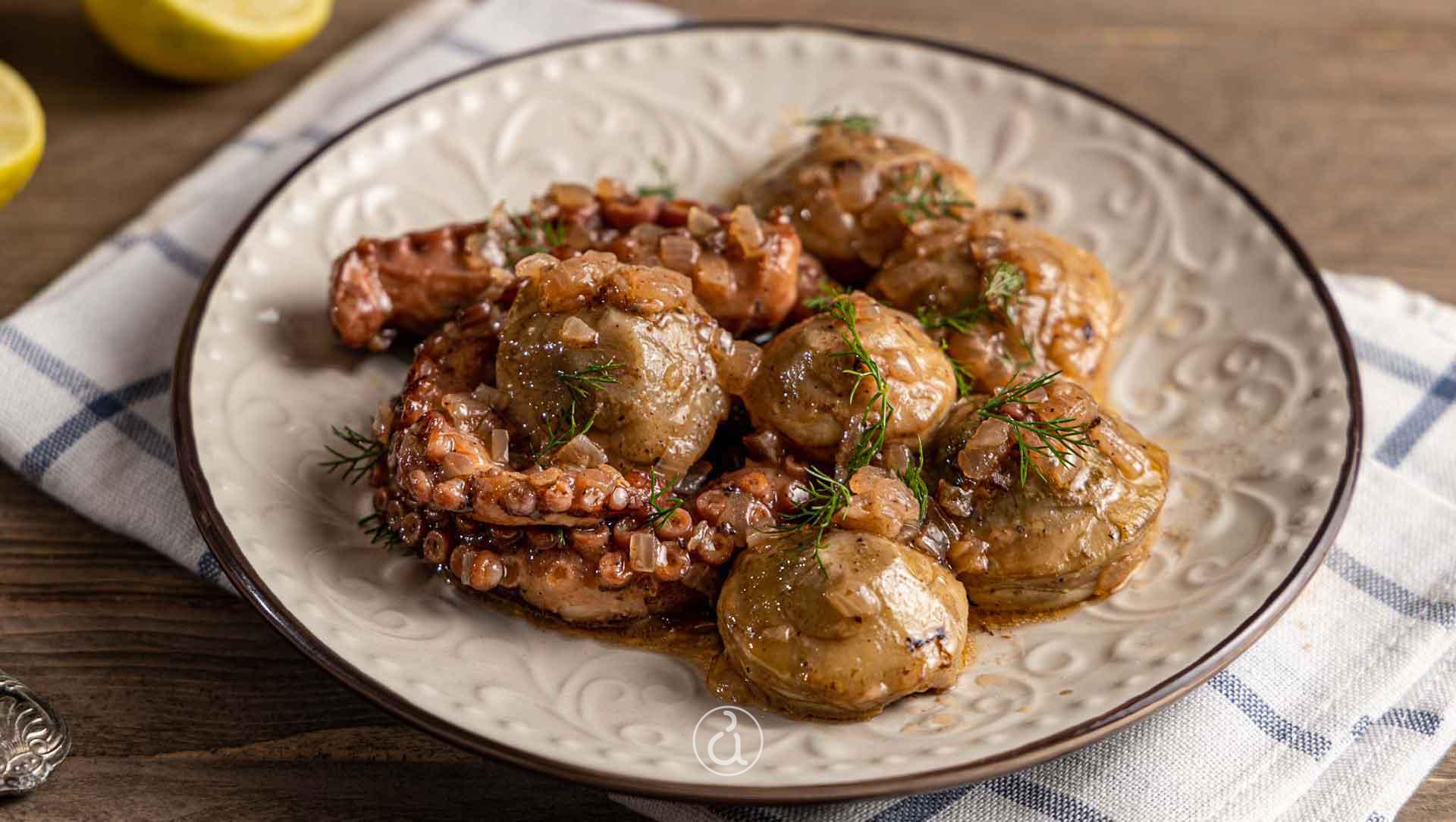 - Cut the cooked octopus into pieces and add it, along with any cooking liquids, to the pan with the artichokes.