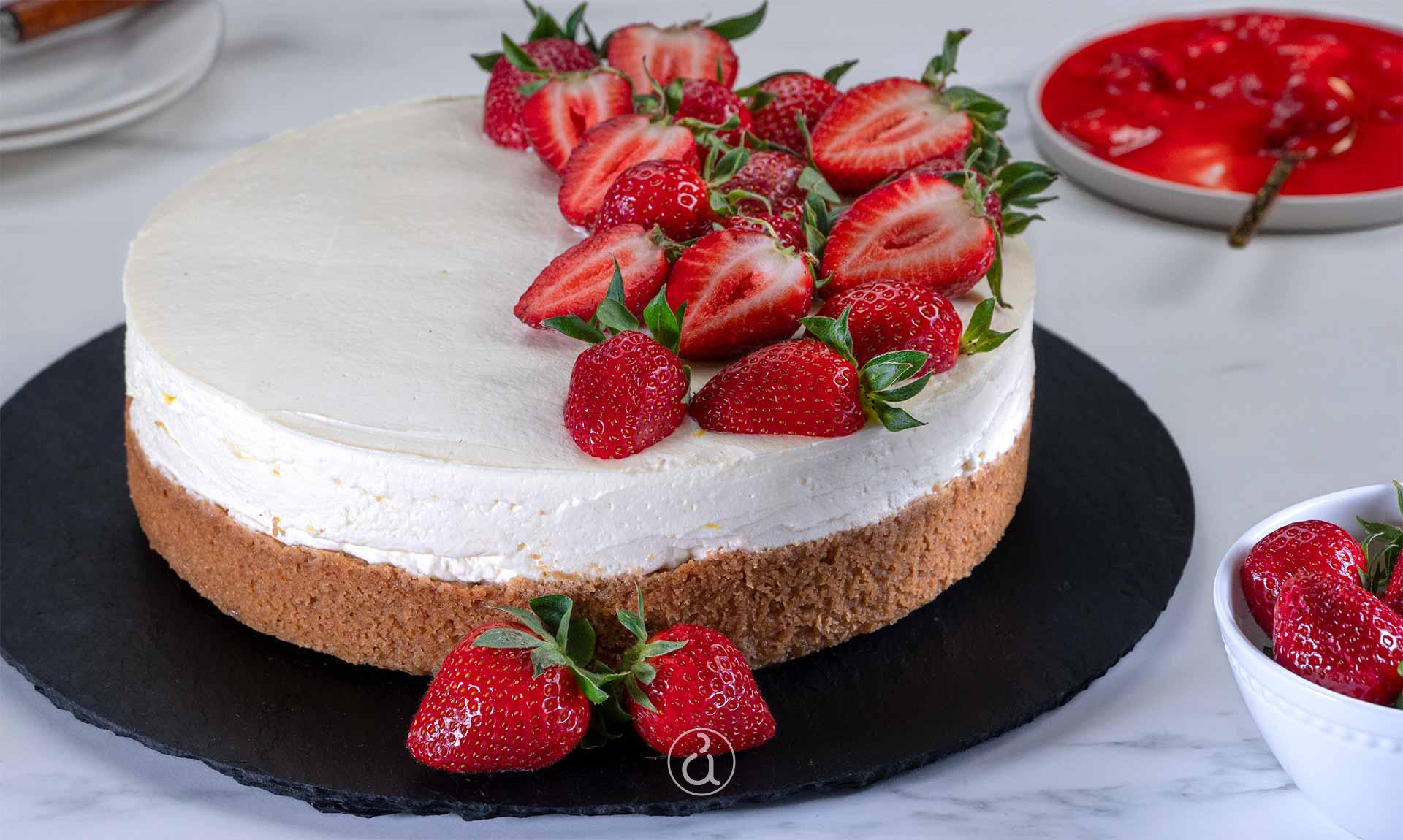 - Once chilled, remove the cheesecake from the springform pan and garnish with fresh strawberries and a drizzle of the strawberry sauce on each slice.
