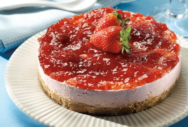 - Once set, remove it from the pan and garnish with fresh strawberries.