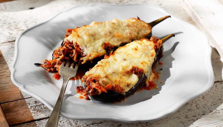 - Fill the baked eggplants with the thick meat sauce.