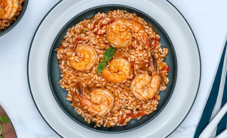 - Immediately serve the tomato and shrimp risotto on 4 plates, garnish with basil leaves and a few drops of olive oil.