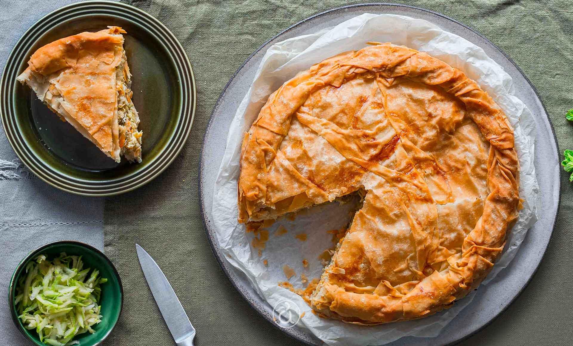 - Alternatively, bake the zucchini pie in a convection over on the middle rack at 170°C until the phyllo is golden brown.