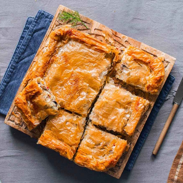 This comforting, savory pie features a hearty filling of mashed potatoes, sautéed mushrooms, and sweet leeks, wrapped in crisp phyllo pastry. It’s a vegetarian classic from Greek cuisine—perfect as a main or side dish, and even better the next day.