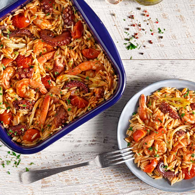 A hearty yet light and incredibly flavorful seafood giouvetsi that’s sure to become a favorite at your table. Tender shrimp and octopus are simmered with orzo in a fragrant seafood broth, finished with fresh herbs and a splash of lemon.