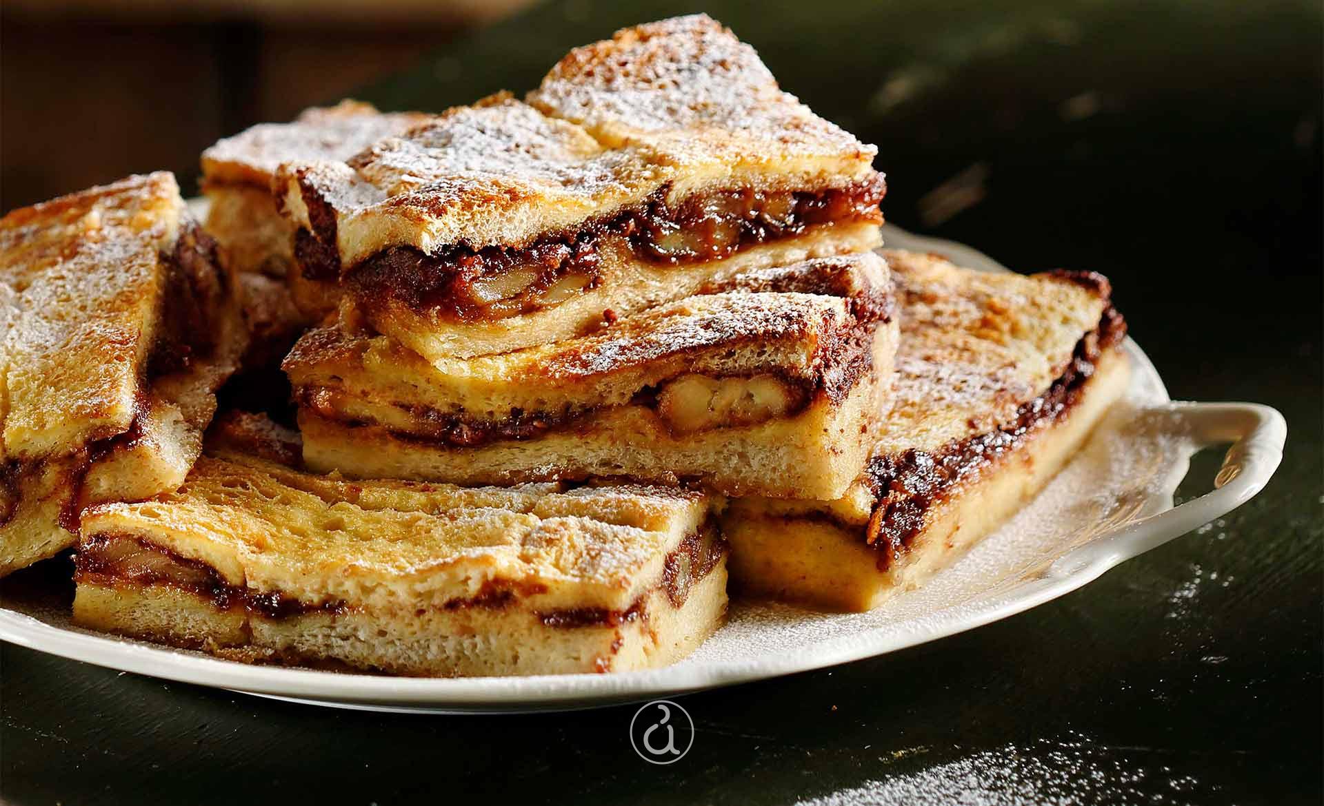 - Spread a layer of caramelized bananas over the bread and cover with the chocolate praline.