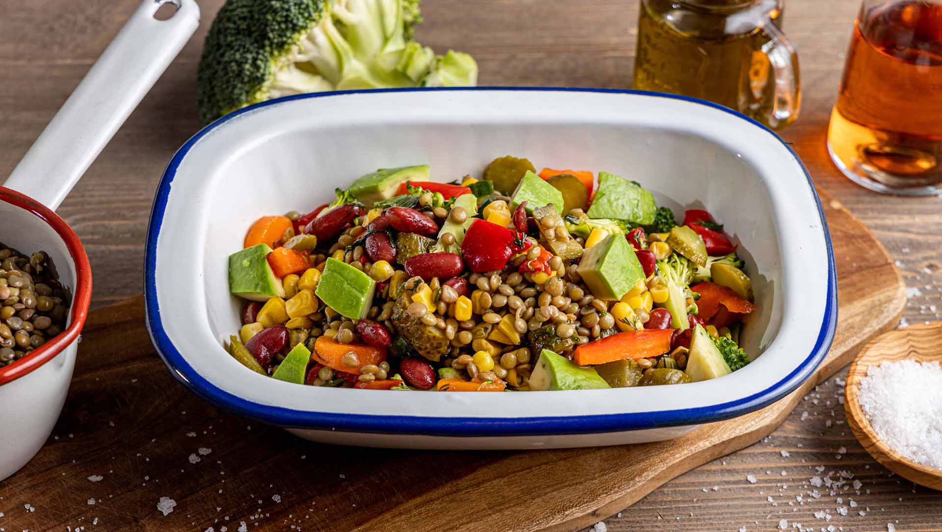 This filling and nutricious meal will feed a family four, and takes just 30 minutes from peparation to your plate! Note that this salad can be marinated in the fridge and tastes even better the second day. Just dont forget to add the avacado just before serving to avoid it turning brown.