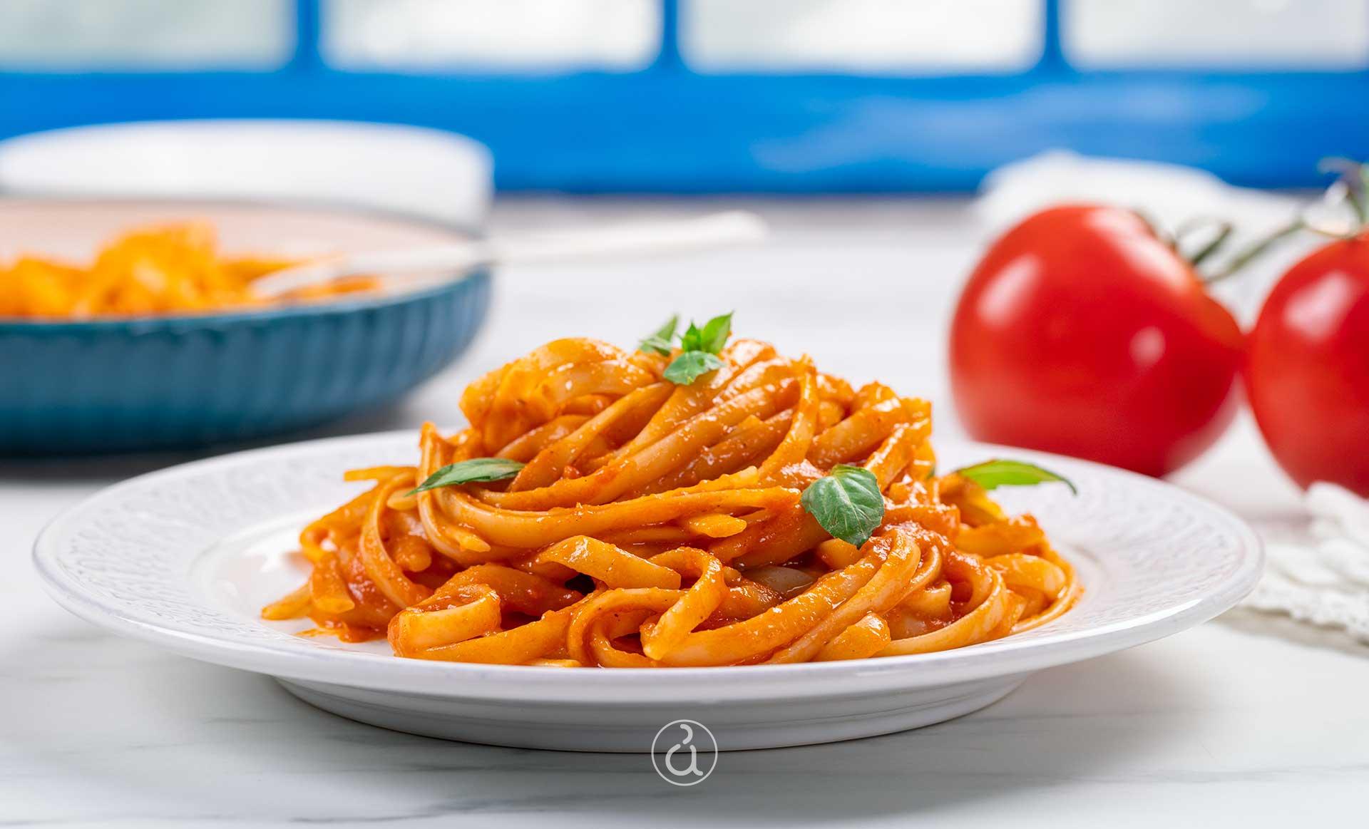 - Serve the pasta al pomodoro immediately, garnished with basil leaves and freshly ground pepper.