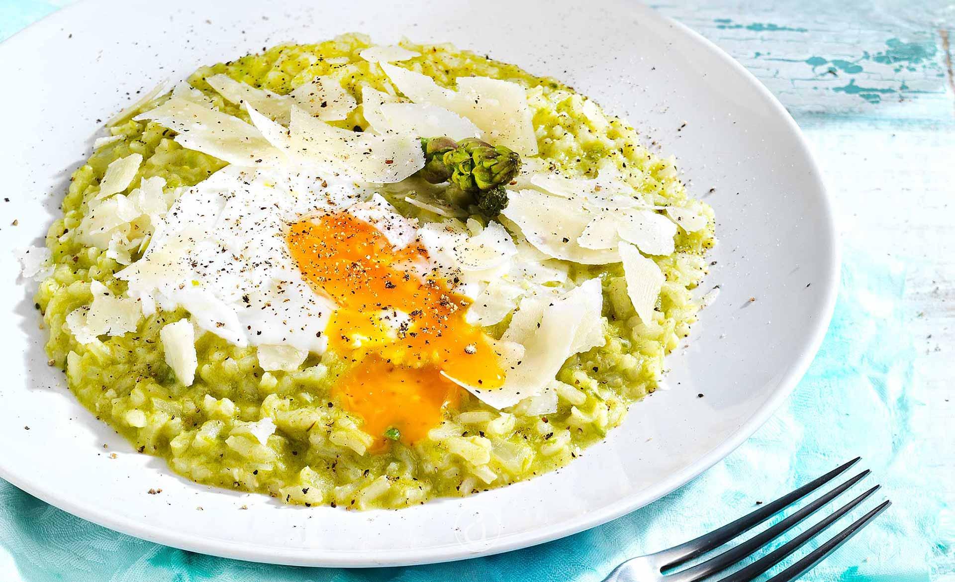 - Serve immediately in warm bowls, garnished with one poached egg per serving, a few asparagus spears arranged decoratively on the plate, and shavings of Parmesan.