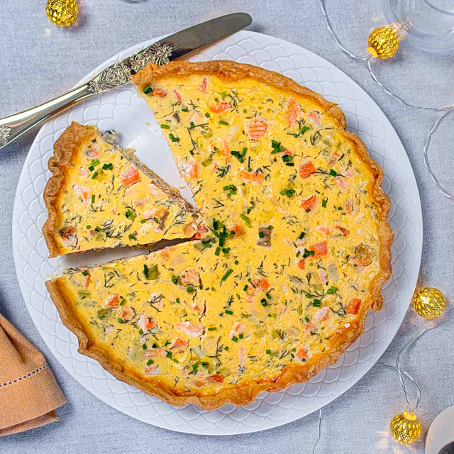 A delightful tart featuring fresh salmon and a creamy, aromatic filling. Easy to make yet impressive, perfect as an appetizer or light meal, with rich flavors and a silky texture