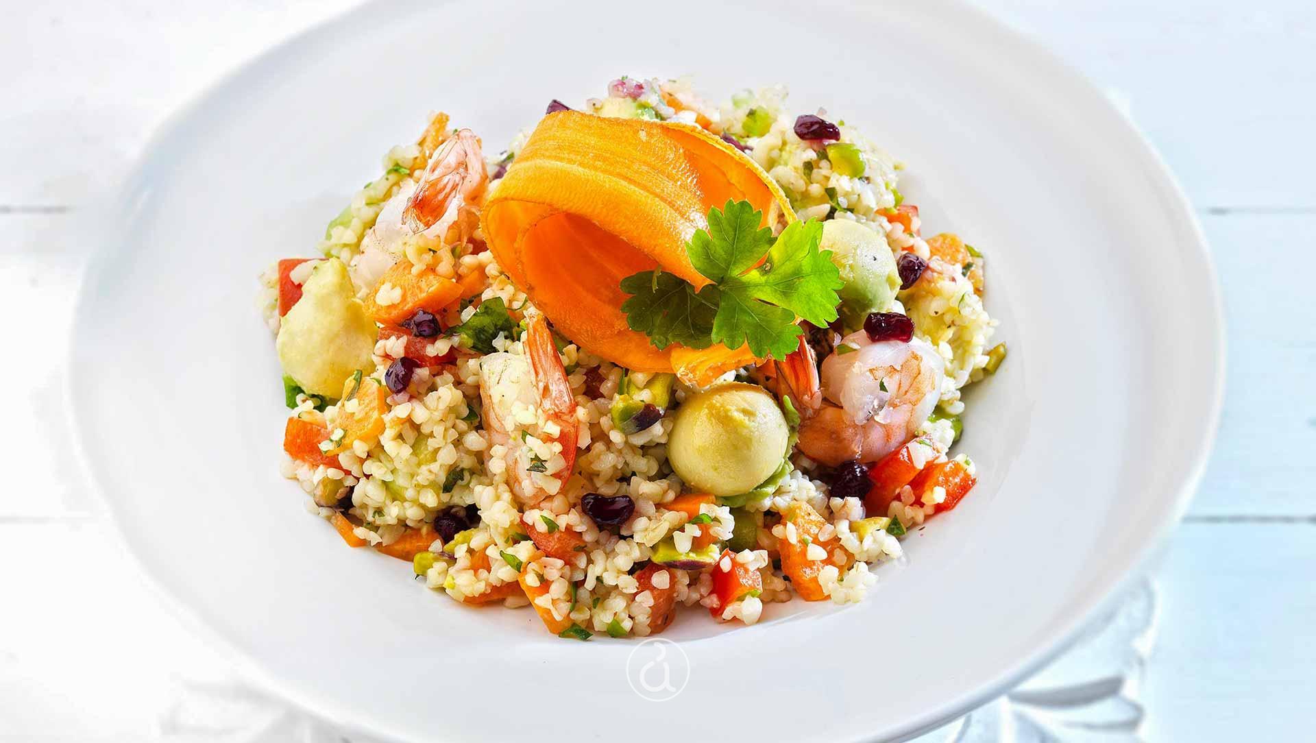 A light and refreshing salad packed with fresh herbs, citrus, and crunchy textures, balanced with creamy tahini and juicy shrimp!