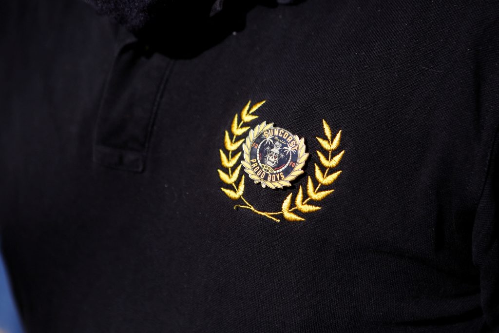 An unidentified member of the Proud Boys and supporter of Republican presidential nominee Donald Trump rallies outside an early polling precinct as voters cast their ballots in local, state, and national elections, in Clearwater, Florida, U.S., November 3, 2024. REUTERS/Octavio Jones