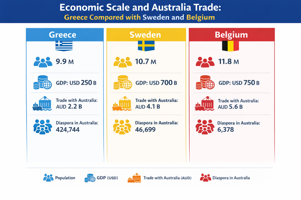 A comparison with similarly sized European economies illustrates the practical consequences of these structural dynamics. Sweden and Belgium, with populations comparable to Greece, maintain significantly higher levels of trade with Australia.