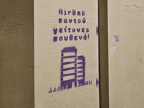 Street Graffiti in Athens translating to “Airbnbs everywhere, neighbors nowhere!”