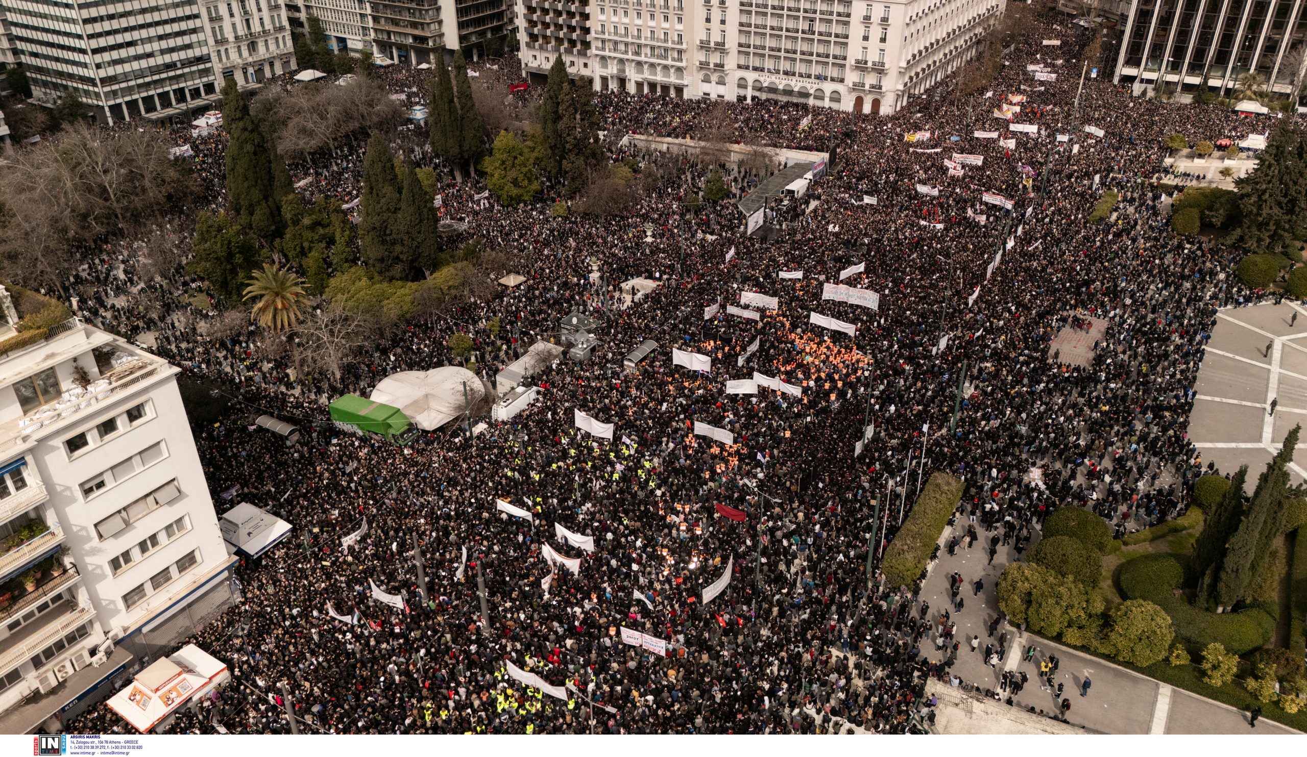 An image of the Tempi demonstration of February 28, 2025, at Syntagma square in downtown Athens. Turnout numbered in the hundreds of thousands while protests were organized in other cities in Greece and throughout the world.