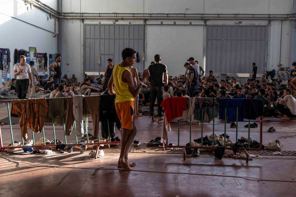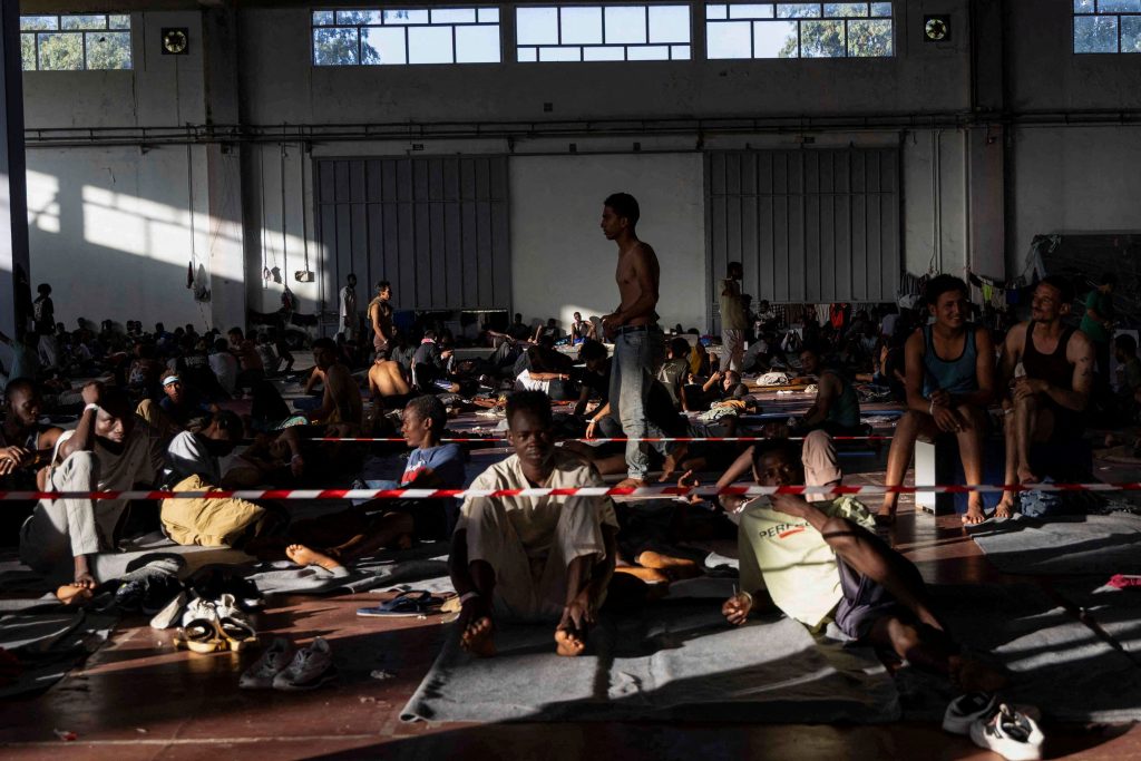 Newly-arrived migrants are sheltered in a municipal hall, in the town of Agyia, on the island of Crete, Greece, July 10, 2025. REUTERS/Nicolas Economou