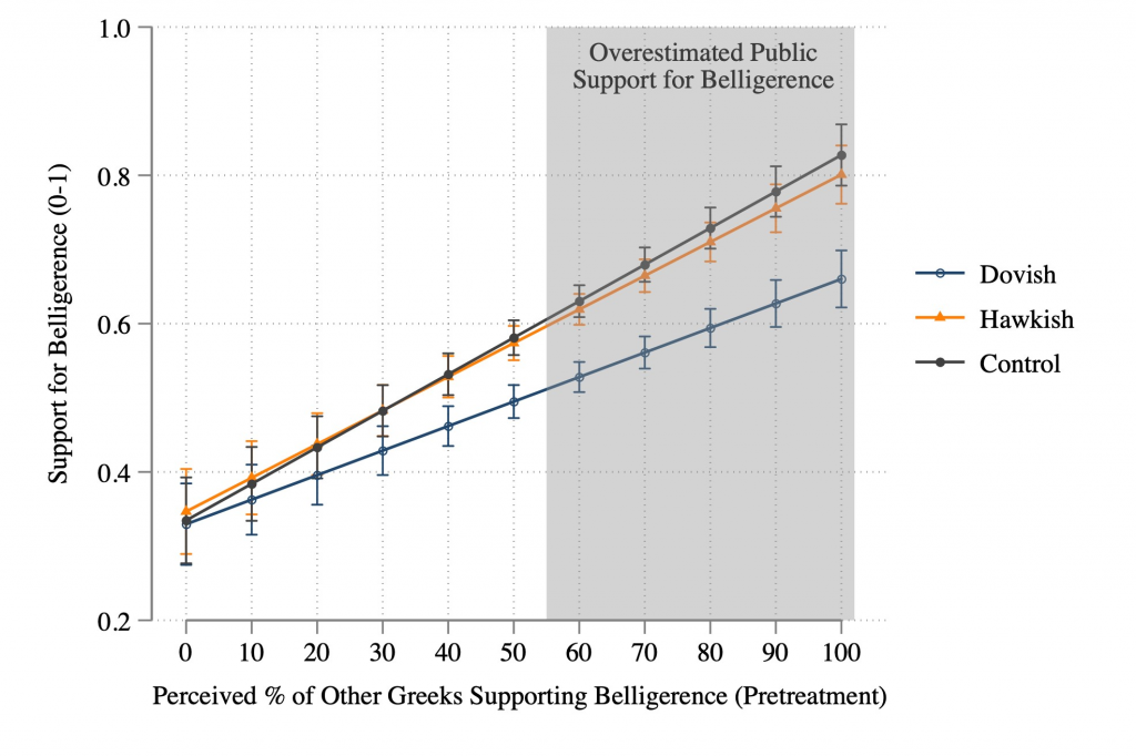 To answer that question, we manipulated perceptions of public opinion. No deception was involved: we simply presented selective facts and figures from our previous surveys of Greek public opinion. What we found was that our respondents’ support for belligerence declined when they were provided with accurate and substantiated information about the small percentage of Greeks who actually support belligerence.