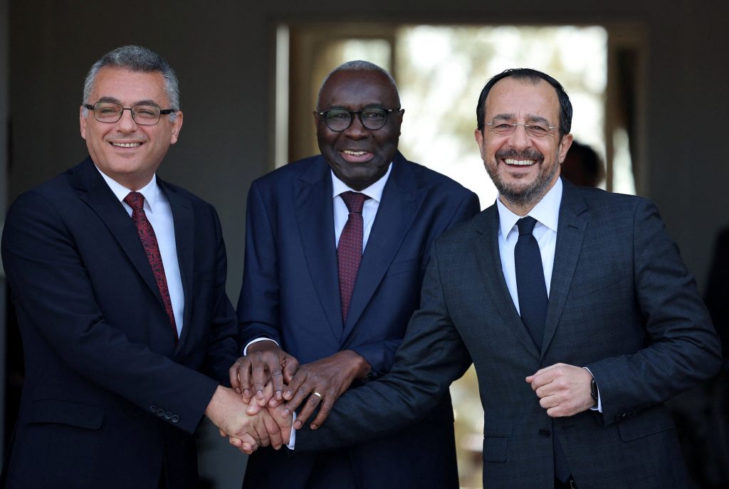 UN Cyprus representative Khassim Diagne shakes hands with Cyprus President Nikos Christodoulides, who leads Cyprus’s Greek Cypriot community, and Turkish Cypriot leader Tufan Erhurman, before a meeting in the UN buffer zone, in Nicosia, Cyprus November 20, 2025. REUTERS/Yiannis Kourtoglou