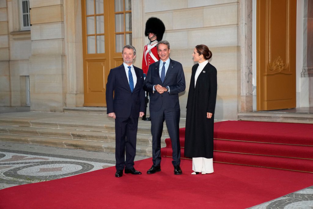 Denmark’s King Frederik and Queen Mary welcome Greece’s Prime Minister Kyriakos Mitsotakis to dinner on the occasion of a meeting of the European Political Community, at Amalienborg Palace, in Copenhagen, Denmark, October 1, 2025. Ritzau Scanpix/Ida Marie Odgaard via REUTERS